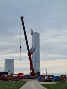 De grote kraan hijst ook de nacelle (het huisje), de generator (die wekt de stroom op, net als de dynamo in de auto) en de hub (de spin waar de bladen in gemonteerd worden).